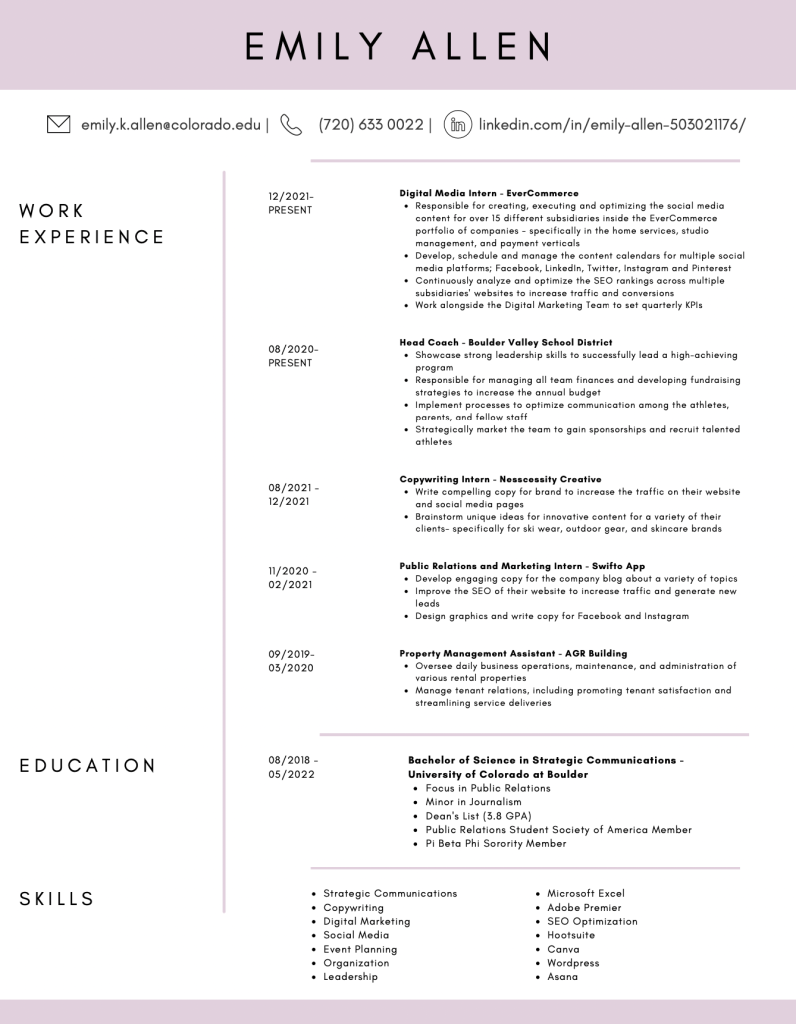 Hi, I’m Emily! I’m a creativity-driven young professional whose passion lives in communications. Whether it be telling a brand’s story on social media or collaborating with a team to bring a campaign to life- I am eager to dive in!
